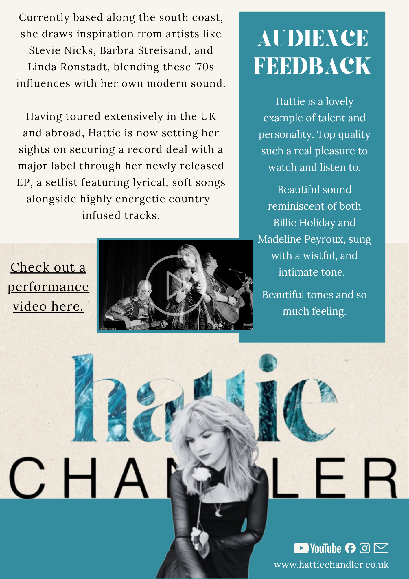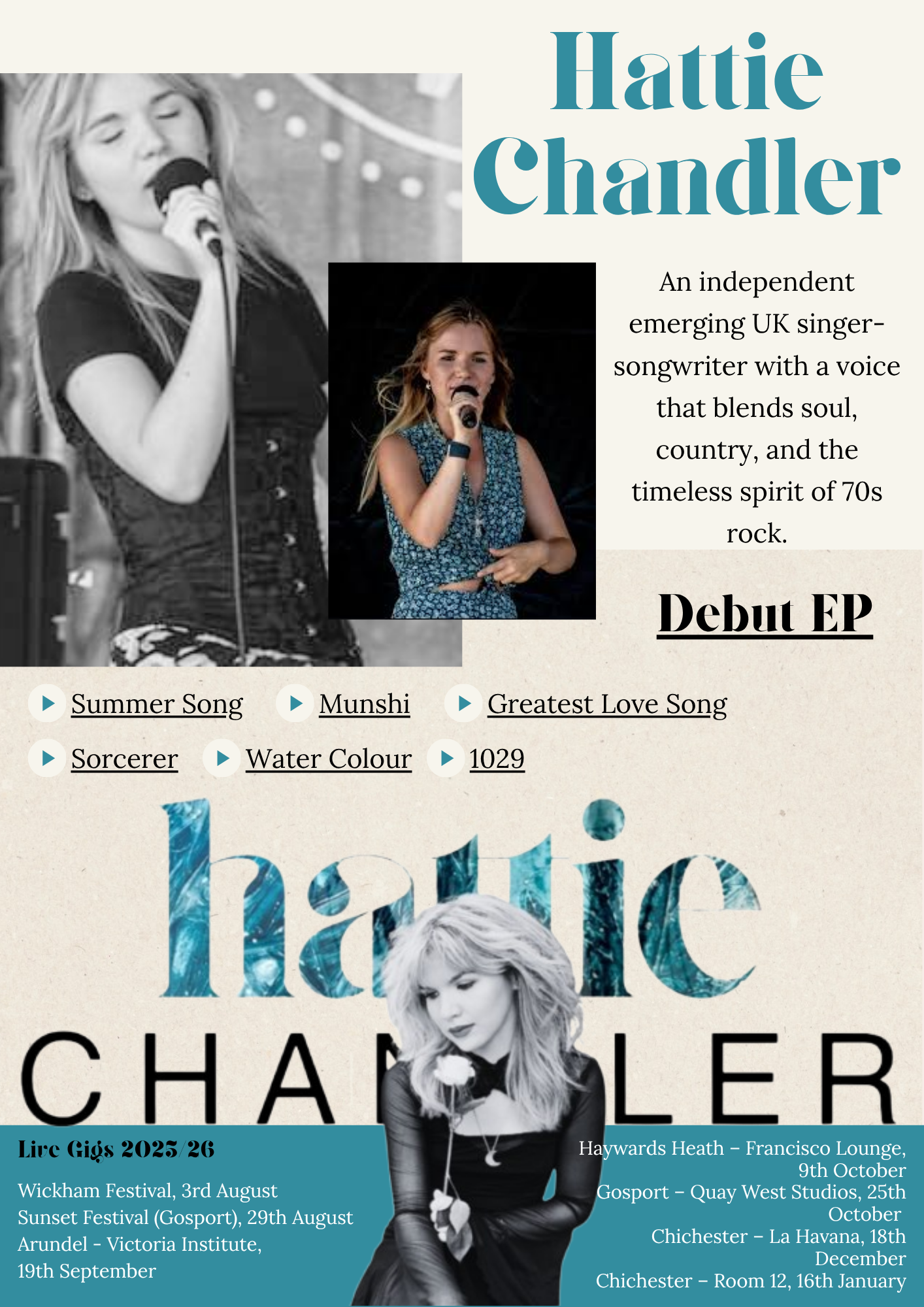 I am currently working with Hattie and her team on the launch of her debut EP, Watercolours, a beautiful setlist featuring lyrical, soft songs alongside highly energetic country-inspired tracks. Over the next three years, our shared goal is to build a strong, loyal fanbase across all platforms and ultimately secure a major record deal.